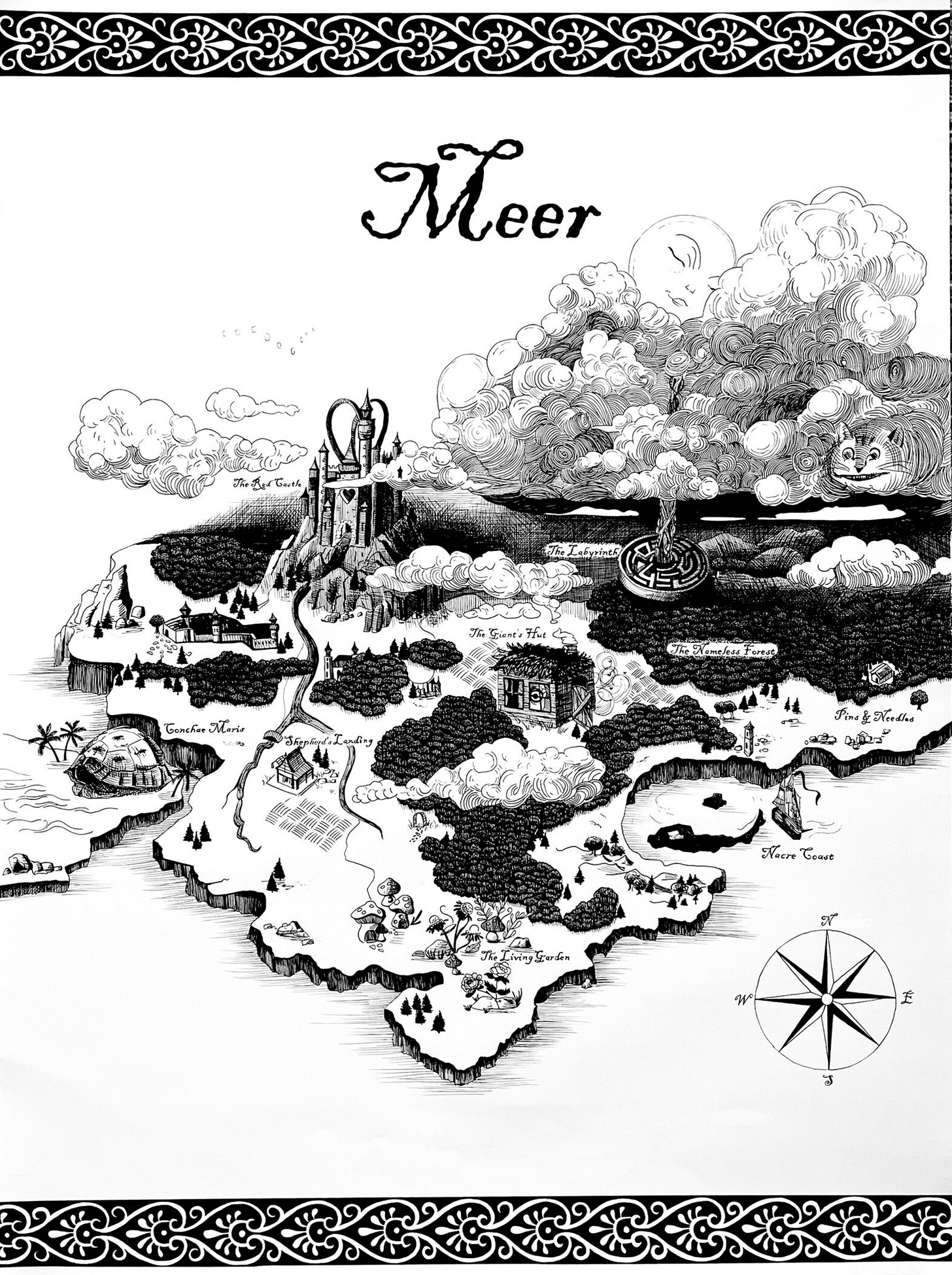 Nora, the cover artist and illustrator of Pawn, did a fantastic job of rendering Meer. I even changed some details in the book to better align with her creative vision. I adore the little quirks she added to the map, such as the cat in the clouds (a nod to the Cheshire Cat) and the fairy mushrooms in the Living Garden. To get a better look at these details (and more), head over to my Instagram!